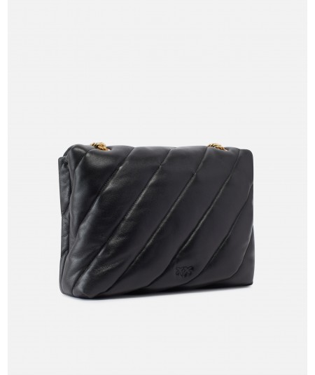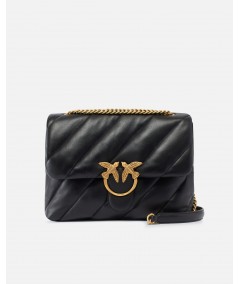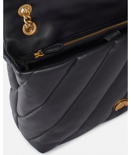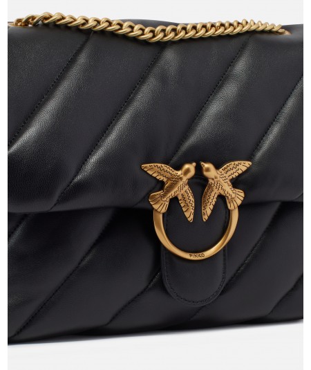 Big Love Bag Puff en cuir nappa souple avec maxi matelassage oblique. La fermeture est complétée par l'emblématique boucle en métal Love Birds Diamond Cut. L'intérieur est doublé en microfibre de suède et comprend une cloison fermée par un zip et une poche murale. La bandoulière combine la chaîne métallique ronde classique avec la bandoulière pratique en cuir nappa.