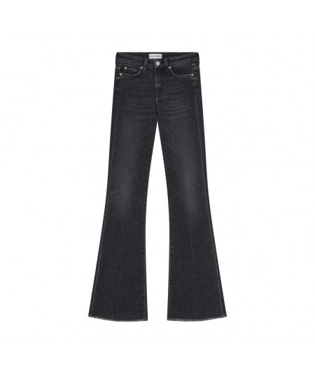 Jean cinq poches pour femme en denim stretch noir, caractérisé par une taille haute et une jambe ajustée jusqu'au genou et évasée vers le bas. Fermeture zippée et bouton pression en métal, typique de l'univers du denim. Ce jean à jambe évasée, inspiré des années 70, est un indémodable du vestiaire printanier, parfait à porter avec une paire de talons texans et une chemise féminine.