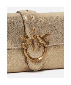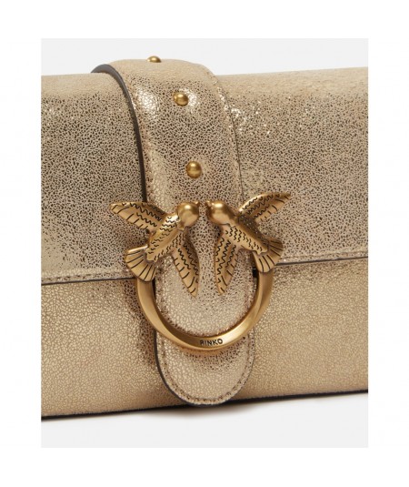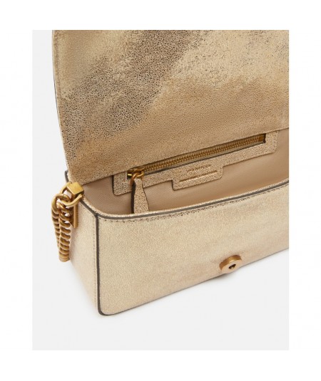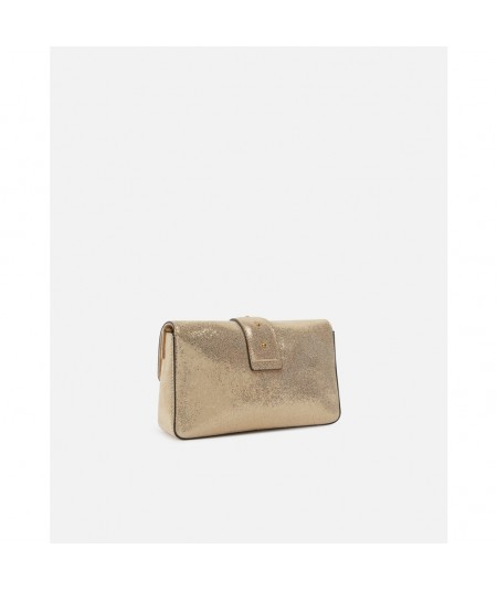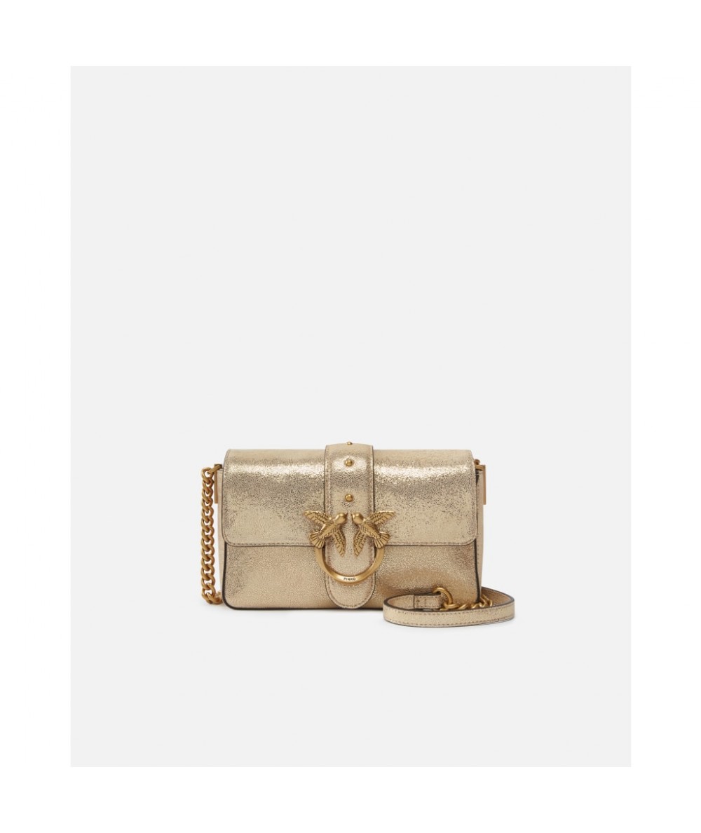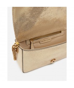 Élégant petit sac bandoulière en daim et cuir laminé, finition pailletée. Doté d'une chaîne métallique fixe et d'une bandoulière réglable en daim pailleté, il est idéal pour un porté épaule ou main. La fermeture est personnalisée par une boucle Love Birds Diamond Cut, et l'intérieur doublé comprend une poche zippée pour organiser vos affaires.