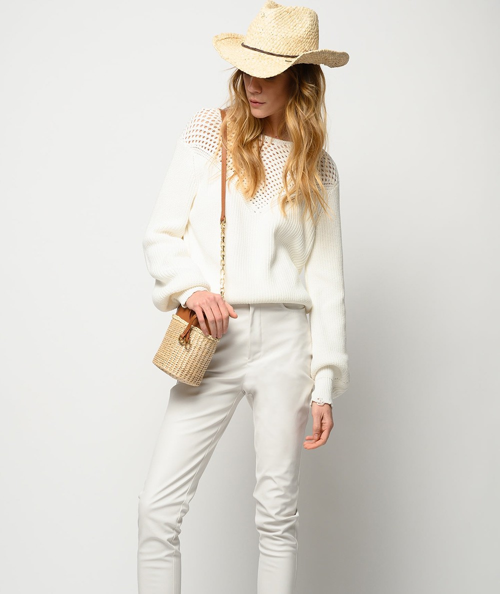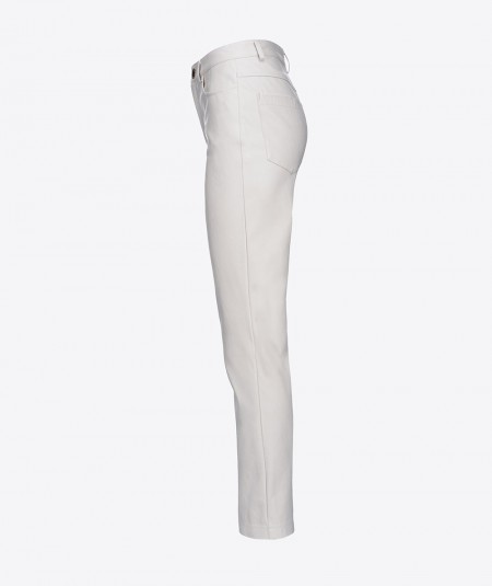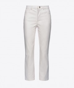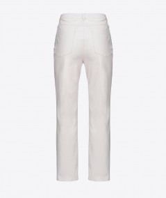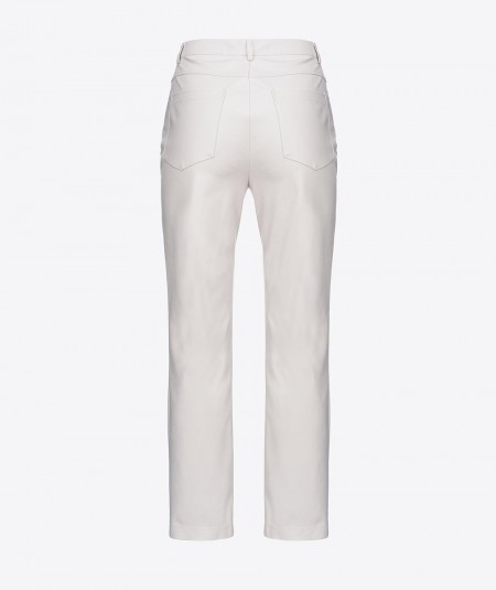 Pantalon skinny cinq poches en tissu effet cuir. Taille haute avec passants pour ceinture. Fermeture à glissière avec bouton à rivet en métal.