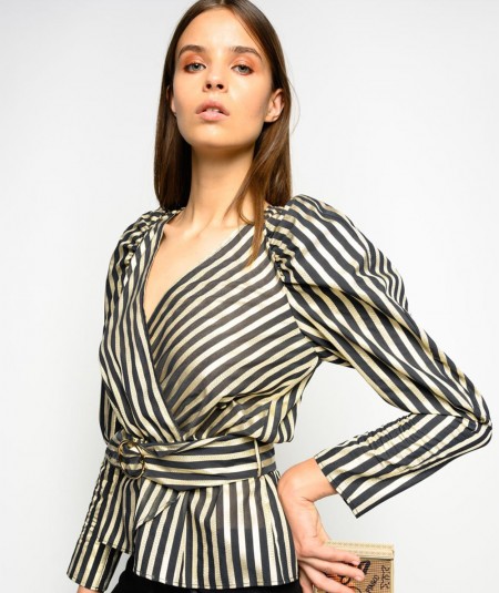 Blouse portefeuille en coton à rayures en lurex présentant une encolure en V croisée sur le devant, des manches longues avec des épaules ballon ainsi qu’une ceinture assortie dans le même tissu dotée d’une boucle ronde en métal. Le mannequin mesure 179cm et porte une taille 40.