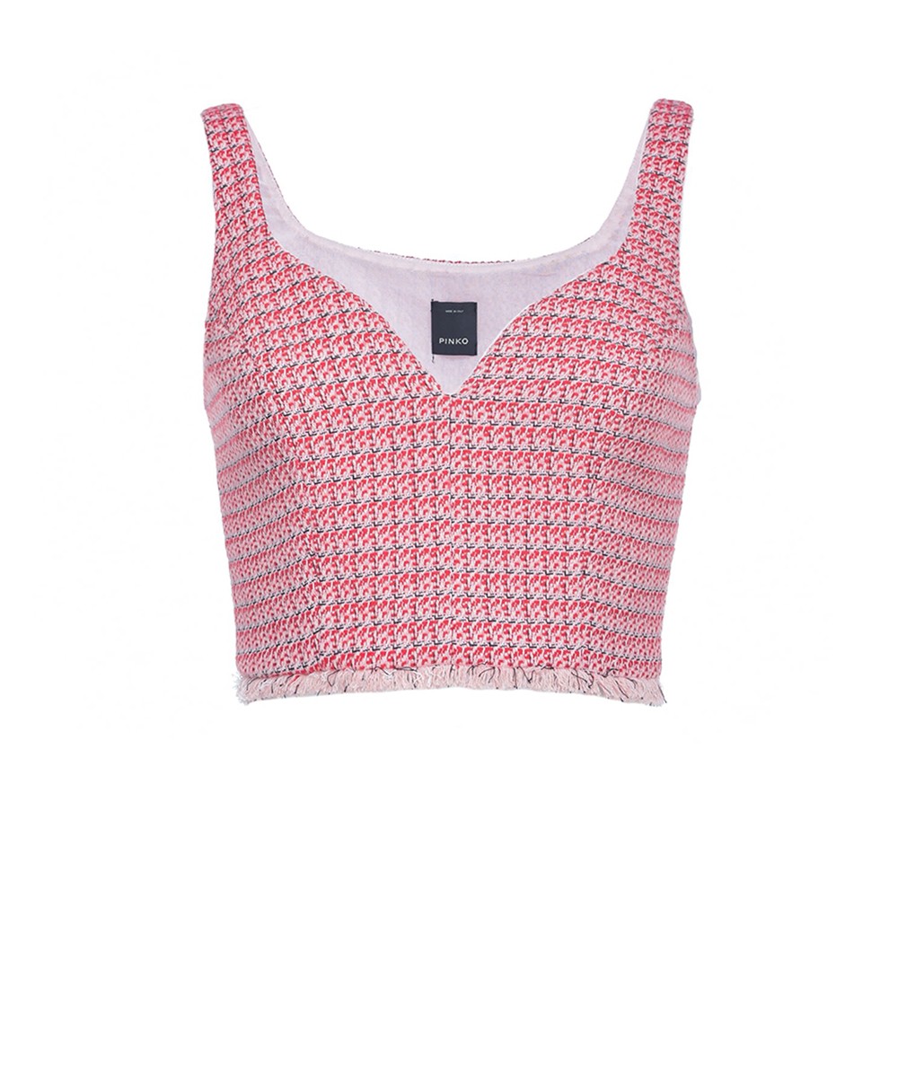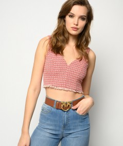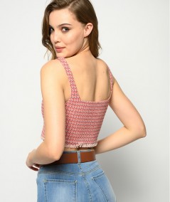 Crop top sans manches en laine et coton mélangés nattés à petits motifs géométriques. Encolure en cœur sur le devant, bretelles et bas de la pièce effet effiloché. Doublure.