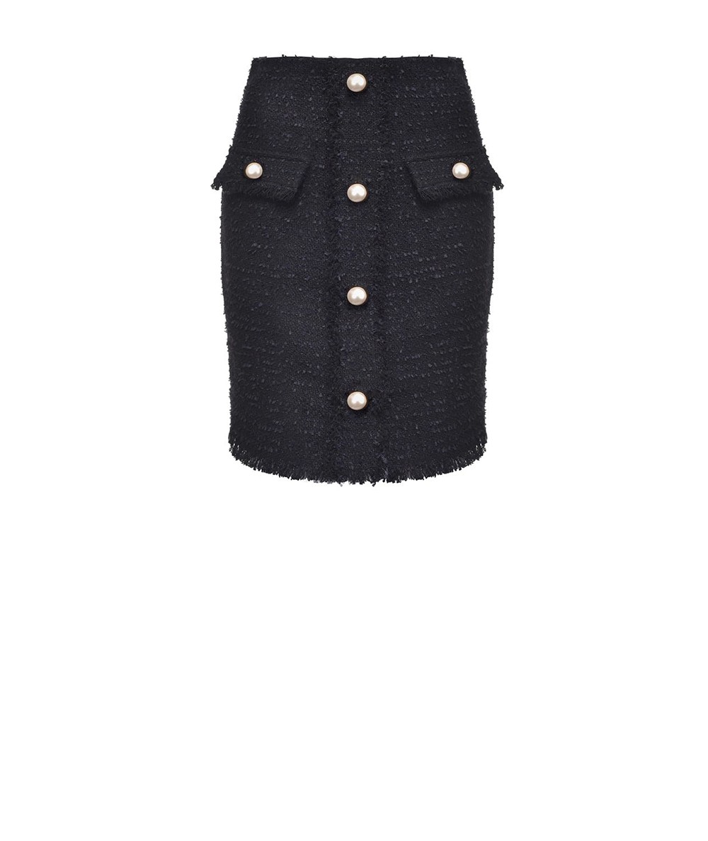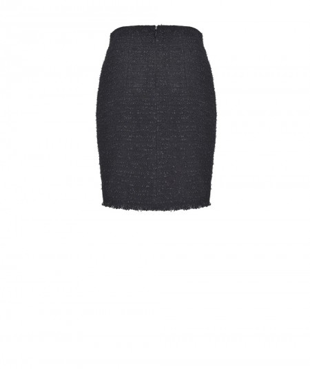 Mini-jupe moulante en tweed présentant des poches dotées d’un rabat et des boutons en métal. Doublure. Fermeture à glissière centrale invisible à l’arrière.