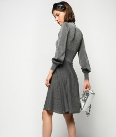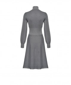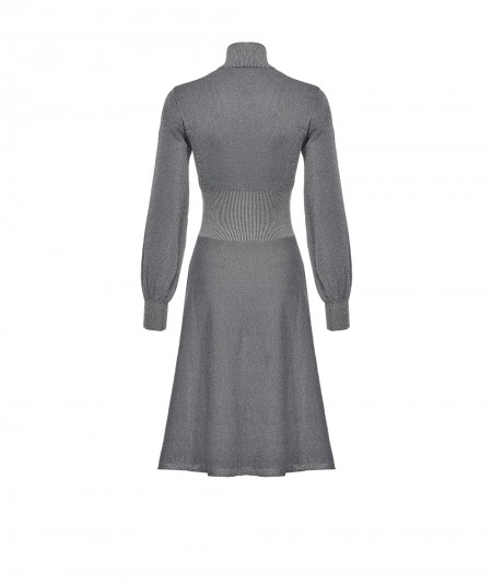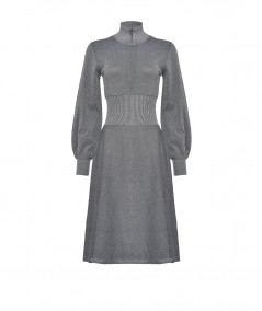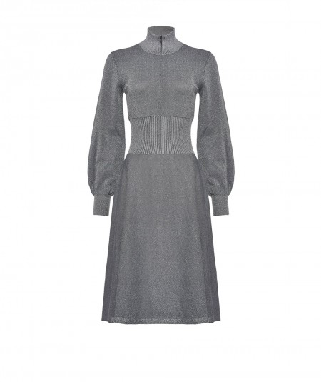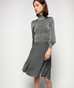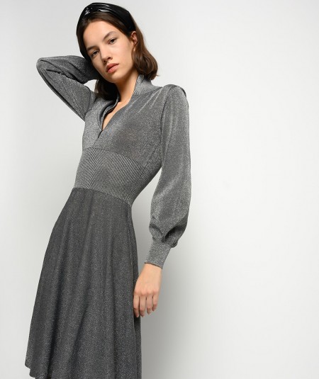Robe midi en maille lurex vanisée avec col montant fermé par une fermeture à glissière et manches longues au volume légèrement ample dotées de poignets. Jupe légèrement évasée sur le bas.
