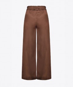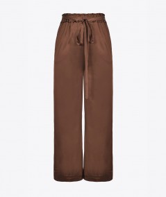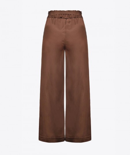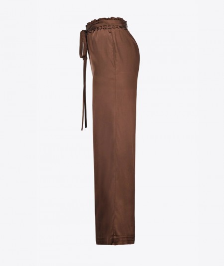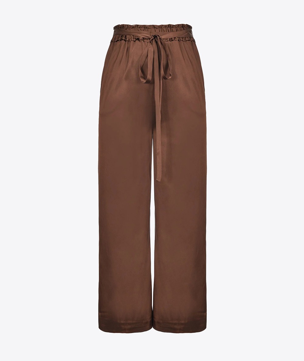 Pantalon large à silhouette palais en satin de soie extensible. Taille haute avec élastique et détail bouclé complété par une ceinture mince à ruban à nouer.