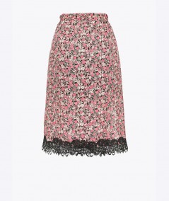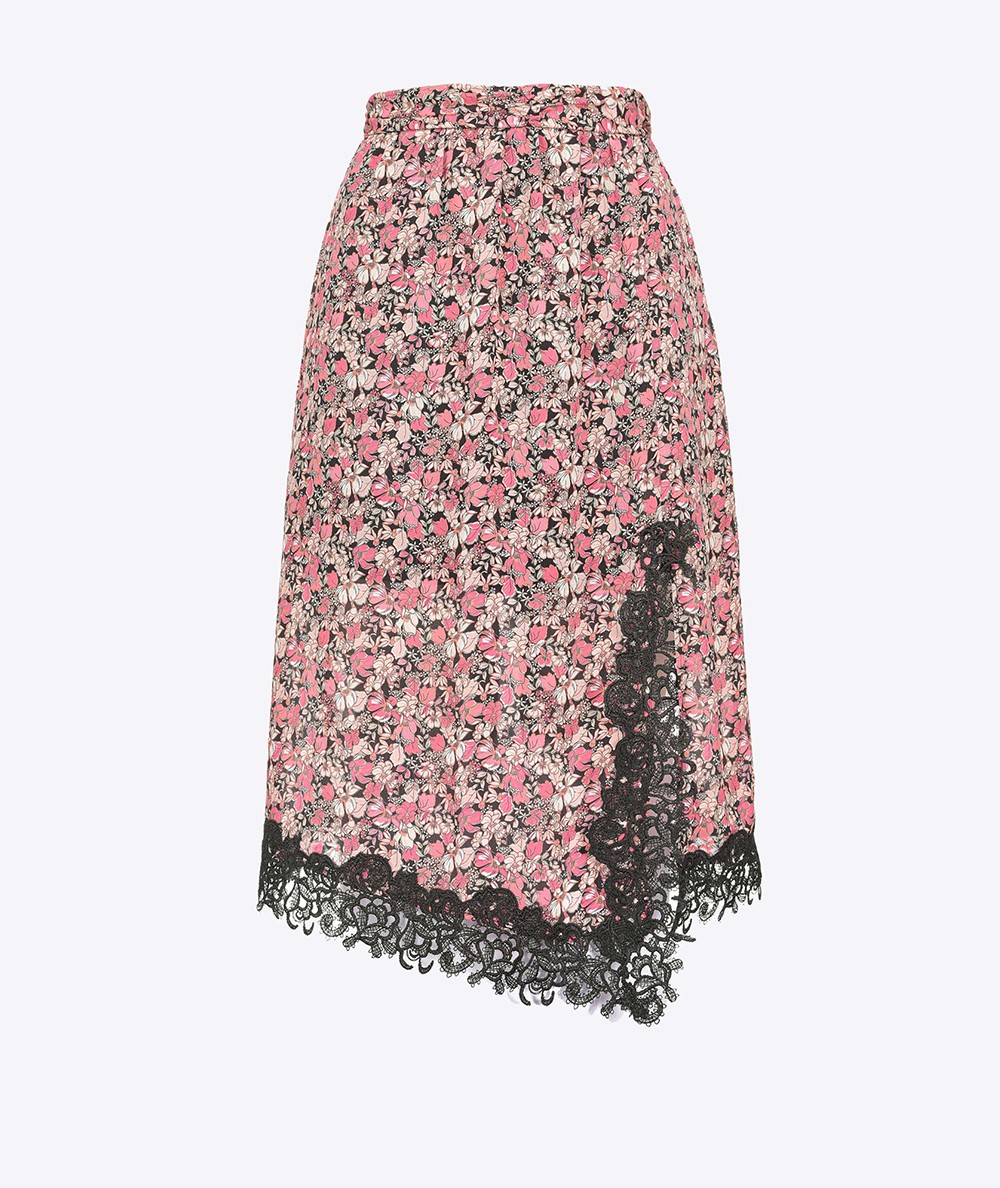 Jupe mi-longue en double georgette à imprimé floral, ligne légèrement évasée avec fente sur le devant bordée de dentelle, qui crée un ourlet asymétrique. Empiècement élastique à la taille.