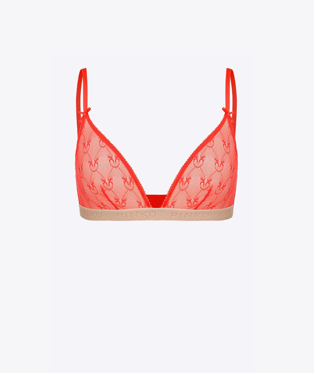 Soutien-gorge triangle en dentelle jacquard à motif Love Birds all-over. Fines bretelles réglables ornées d’un petit nœud et bande élastique griffée sur le thorax. Fermeture réglable par agrafes au dos