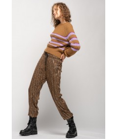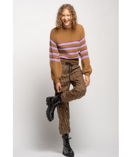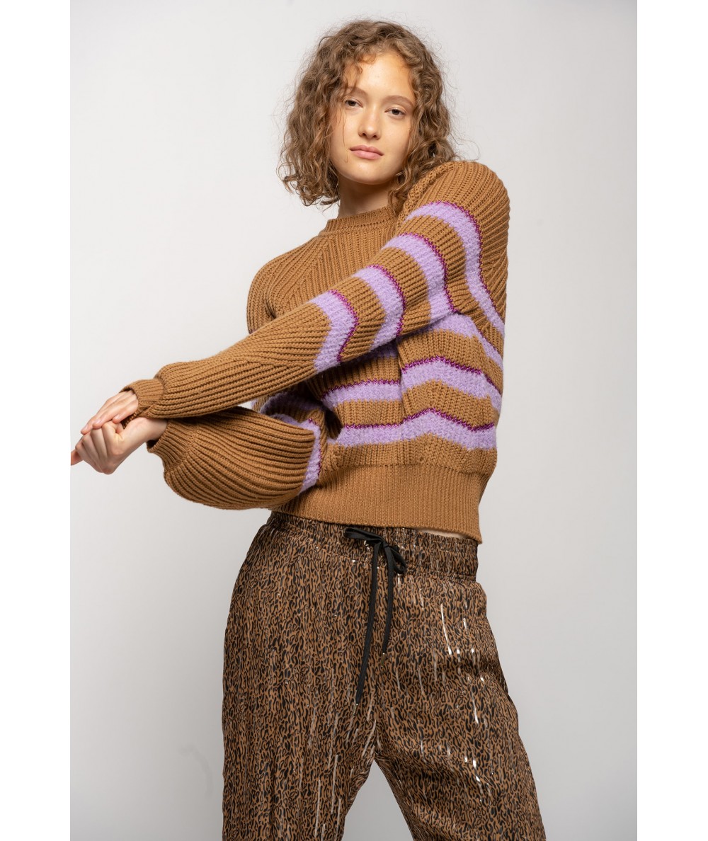 Pull en maille de laine mélangée travaillée en côtes anglaises, avec un détail de rayures horizontales bouclées en lurex. Encolure ronde, longues manches raglan au volume légèrement plus ample sur le bas et resserrées au poignet.