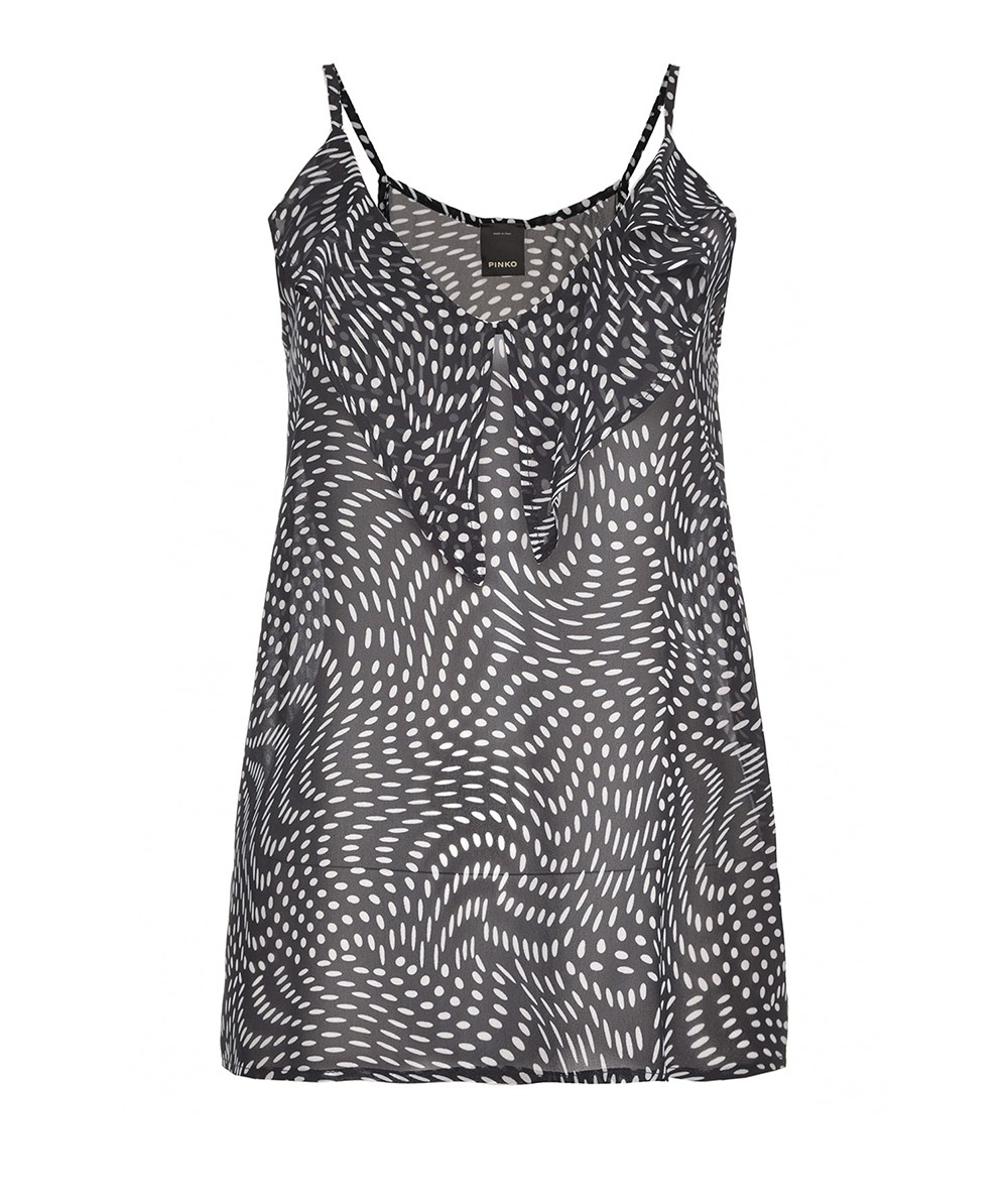Top sans manches avec bretelles fines en crêpe georgette avec pois asymétriques. Encolure en V bordée de grands volants.